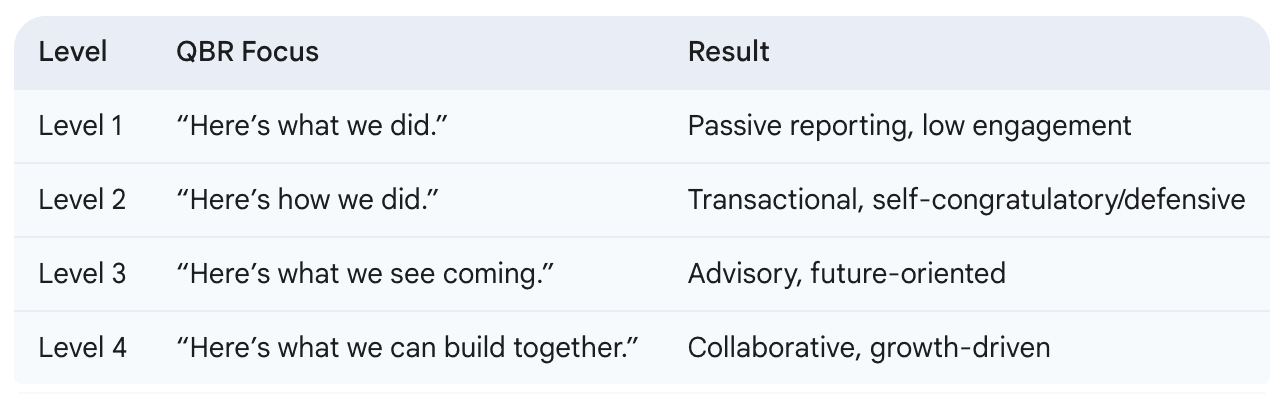 That’s what moves you from vendor to partner. Here’s a simple QBR maturity curve: